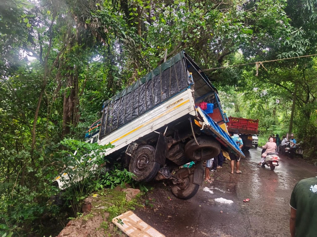 मंगळवारी सकाळी नेहमीप्रमाणे टेम्पो चालक गणेश तांडेल आपल्या ताब्यातील महिंद्रा पिकप टेम्पोसह मच्छी विक्रेत्या महिलांना घेऊन मालवण येथून कणकवलीच्या दिशेने जात असताना साडेनऊच्या दरम्याने आनंदव्हाळ उतारावर समोरून ओव्हरटेक करीत येत असलेल्या कारला वाचवण्यासाठी ब्रेक मारल्याने रस्त्याकडेची दगडी भिंत कोसळून अपघात झाला सुदैवाने टेम्पो खाली दरीत जाता जाता झाडाला धडक बसल्याने थांबाला नाहीतर मोठी दुर्घटना घडली असती.