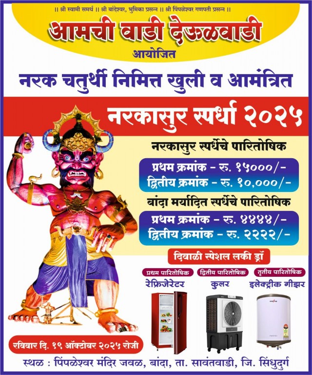 सावंतवाडी : दरवर्षी प्रमाणे यंदाही बांदा येथील आमची वाडी देऊळवाडी मित्रमंडळाने नरक चतुर्थी निमित्त बांदा पिंपळेश्वर गणपती मंदिर येथे रविवार दि. १९ ऑक्टोबर रोजी खुली नरकासूर स्पर्धा आयोजित केली आहे.