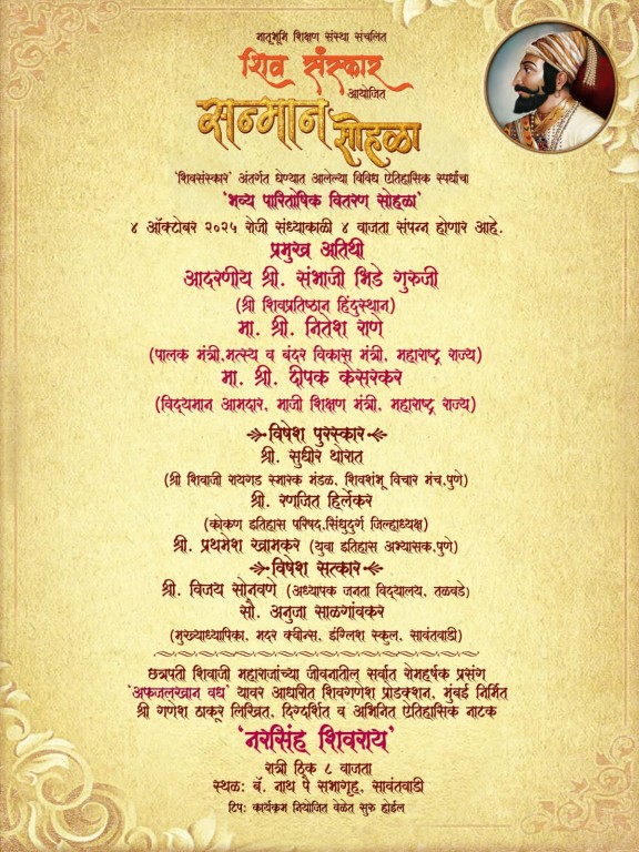 सावंतवाडी : मातृभूमि शिक्षण संस्था संचलित ‘सन्मान शाहळा’ यांच्या वतीने ‘शिवसंस्कार’ या उपक्रमांतर्गत घेण्यात आलेल्या विविध ऐतिहासिक स्पर्धांचा भव्य पारितोषिक वितरण सोहळा आज शनिवारी, ४ ऑक्टोबर २०२५ रोजी संध्याकाळी ३.३० वाजता बॅ. नाथ पे सभागृह, सावंतवाडी येथे आयोजित करण्यात आला आहे. या सोहळ्यास पालकमंत्री, मत्स्य व बंदर विकास मंत्री नितेश राणे प्रमुख अतिथी म्हणून उपस्थित राहणार आहेत.