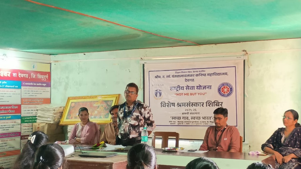 देवगड : श्रीम.एन.एस.पंतवालावलकर कनिष्ठ महाविदयालय देवगडच्या वतीने कुणकेश्वर येथे राष्ट्रीय सेवा योजना अंतर्गत सात दिवसांचे विशेष श्रमसंस्कार शिबिराचे आयोजन करण्यात आले आहे. या संस्कार शिबिराच्या अनुषंगाने सहभागी विदयार्थ्यांमध्ये विशेष संस्कार रूजविण्या करीता वेगवेगळे विषय आणि उपक्रम ठेवण्यात आले आहेत. विदयार्थ्यांमधे सामाजिक जाणीव निर्माण करण्याकरीता शासनाच्या विविध सामाजिक योजनांची माहिती देण्याकरीता देवगड तहसिल मधले शासकिय सेवक प्रदिप कदम यांचे विशेष असे मार्गदर्शन आयोजित करण्यात आले होते.