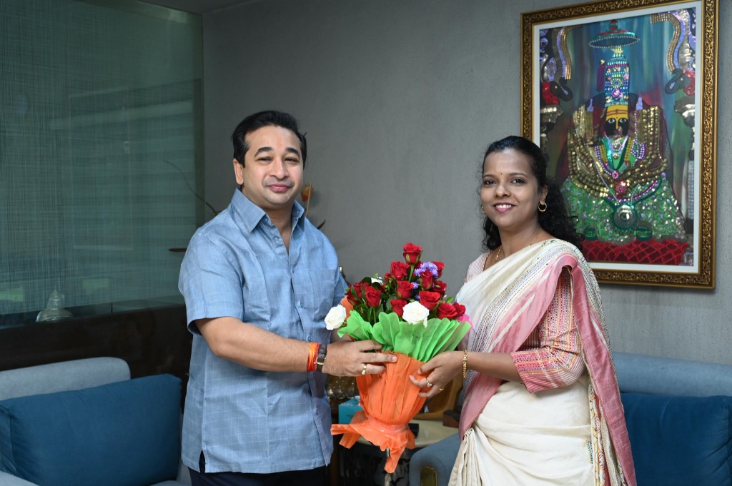 कणकवली : सिंधुदुर्गच्या नूतन जिल्हाधिकारी तृप्ती धोडमिसे यांनी पालकमंत्री नितेश राणे यांची येथील ओम गणेश निवासस्थानी भेट घेतली. तृप्ती धोडामिसे यांनी नुकताच सिंधुदुर्गच्या जिल्हाधिकारी पदाचा कार्यभार स्वीकारला आहे. दरम्यान, पालकमंत्री नितेश राणे यांनीही धोडमिसे यांचे स्वागत केले.