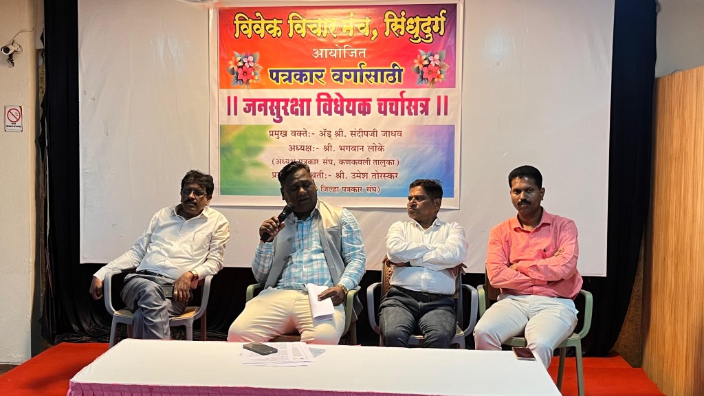 जानवली येथील नीलम कंट्रीसाईट येथे अॅड. संदीप जाधव यांचे जनसुरक्षा विधेयकावर चर्चासत्र आयोजित केले होते. याप्रसंगी अॅड. जाधव बोलत होते. यावेळी जिल्हापत्रकार संघाचे अध्यक्ष उमेश तोरसकर, परिषद प्रतिनिधी गणेश जेठे, कणकवली तालुका पत्रकार संघाचे अध्यक्ष भगवान लोके, डॉ. मिलिंद कुलकर्णी हे उपस्थित होते. अॅड. जाधव म्हणाले, देशातील पश्चिम प्रांतातून नक्षलवादाचा उदय झाला. ग्रामीण भागात नक्षलवादाचा प्रभाव होता. अलीकडच्या काळात शहरी नक्षलवाद वाढू लागला आहे. नक्षलवादी चळवळीत काम करणाºयांची माओवादी विचारसरणी आहे. ही विचारसरणी हिंसेचे समर्थन करते. २००४ ते २०१४ या काळात नक्षलवादाला खत व पाळबळ देण्याचे काम काँग्रेस सरकारने केले. त्यामुळे नक्षलवाद देशभरात फोपवला. २०१४ नंतर केंद्रात पंतप्रधान नरेंद्र मोदी यांच्या नेतृत्वाखाली सरकार आले. या सरकारने देशाला कीड लागेलल्या नक्षलवाद बीमोड करण्याचा निर्धार केला. १० वर्षांत ग्रामीण भागतील नक्षलवाद कमी झाला असून शहर अर्थात अर्बन नक्षलवाद देशासाठी सर्वांधिक घातक आहे. या वादाला रोखण्यासाठी देशातील काही राज्यांनी जनसुरक्षा विधेयक कायदा लागू केला आहे. हा कायदा लागू झाल्यानंतर त्या राज्यांमध्ये अर्बन नक्षलवादाला काही प्रमाणात बे्रक लागला आहे.