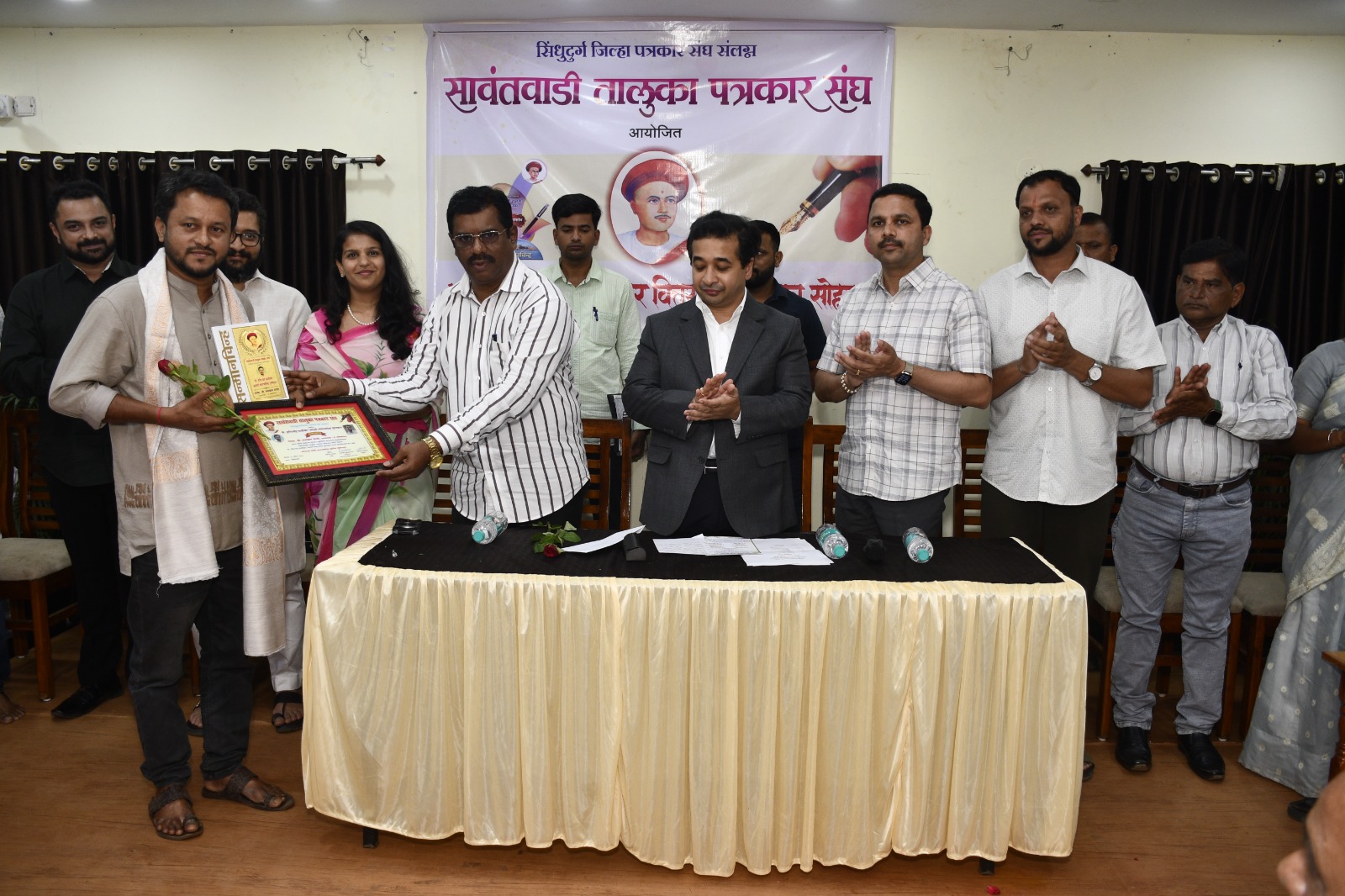 तर सावंतवाडी तालुका पत्रकार संघाच्या वतीने अध्यक्ष सचिन रेडकर यांच्या हस्ते पालकमंत्री नितेश राणे यांचा विशेष सन्मान करण्यात आला. या कार्यक्रमाचे औचित्य साधून सावंतवाडी सहकारी पतपेढीकडून ज्येष्ठ पत्रकार रमेश बोंद्रे यांच्या संकल्पनेतून आद्यपत्रकार बाळशास्त्री जांभेकर यांच्या तैलचित्राचे अनावरण पालकमंत्र्यांच्या हस्ते करण्यात आले.