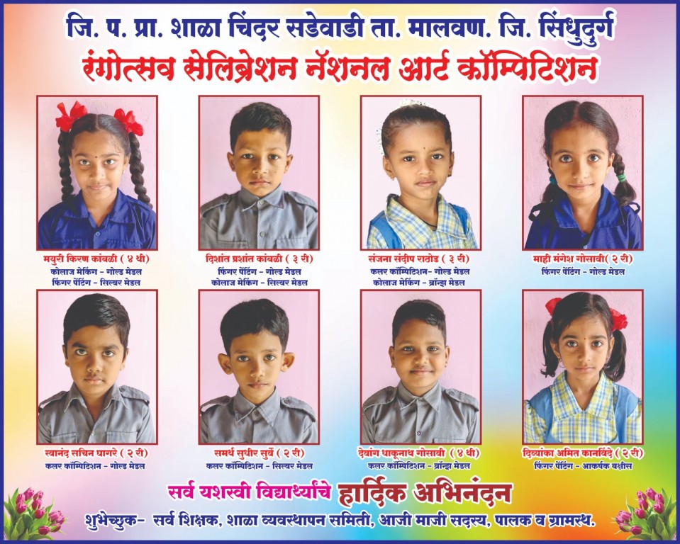 मालवण : शालेय अभ्यासक्रमांव्यतिरिक्त इतर ही परीक्षाना मुलांना प्रविष्ठ होण्याची संधी मिळावी आणि त्यांच्या कला गुणांना वाव मिळावा यासाठी आपल्या जि. प. प्रा. शा. चिंदर सडेवाडी प्रशालेमधील विद्यार्थांनी रंगोत्सव सेलिब्रेशन नॅशनल लेवल आर्ट कॉम्पिटिशन साठी भाग घेतला होता. यामध्ये कलर कॉम्पिटिशन, कोलाज मेकिंग, फिंगर पेंटिंग या परीक्षेस प्रविष्ठ झाले होते. यामध्ये मयुरी किरण कांबळी (4 थी) कोलाज मेकिंग गोल्ड मेडल, फिंगर पेंटिंग सिल्वर मेडल. संजना संदीप राठोड (3 री) - कलर कॉम्पिटिशन गोल्ड मेडल, कोलाज मेकिंग ब्रॉन्झ मेडल, माही मंगेश गोसावी( 2 री) फिंगर पेंटिंग गोल्ड मेडल, स्वानंद सचिन घागरे (2 री) कलर कॉम्पिटिशन गोल्ड मेडल, दिशांत प्रशांत कांबळी (3 री) फिंगर पेंटिंग गोल्ड मेडल, कोलाज मेकिंग सिल्वर मेडल, समर्थ सुधीर सुर्वे (2 री) कलर कॉम्पिटिशन सिल्वर मेडल, देवांग धाकूनाथ गोसावी (4 थी) कलर कॉम्पिटिशन ब्रॉन्झ मेडल, दिव्यांका अमित कानविंदे (2 री) फिंगर पेंटिंग आकर्षण बक्षीस मिळाले. तसेच सर्व सहभागी विदयार्थ्याना नॅशनल लेवलचे सहभाग प्रमाणपत्र प्राप्त झाले आहे.