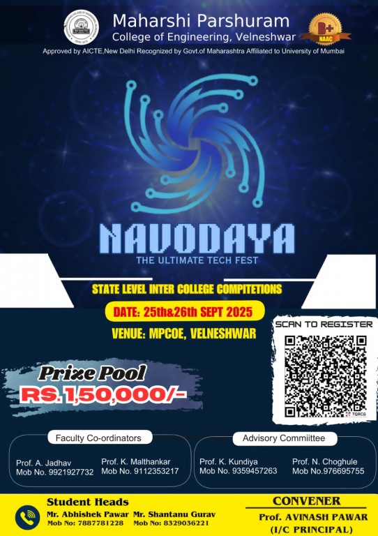 वेळणेश्वर : गुहागर तालुक्यातील महर्षी परशुराम अभियांत्रिकी महाविद्यालयात दिनांक २५ व २६ सप्टेंबर २०२५ रोजी ‘नवोदय २०२५’ या राज्यस्तरीय आंतरमहाविद्यालयीन तांत्रिक महोत्सवाचे आयोजन करण्यात आले आहे. या स्पर्धांचे आयोजन महाविद्यालयाच्या संगणक अभियांत्रिकी व स्थापत्य अभियांत्रिकी विभागांच्या संयुक्त विद्यमाने करण्यात आले असून, संपूर्ण राज्यातून विविध अभियांत्रिकी व विज्ञान शाखांतील विद्यार्थी या महोत्सवात सहभाग घेणार आहेत.