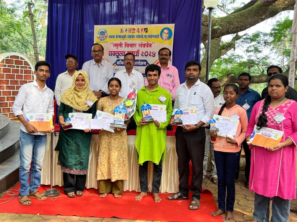 सावंतवाडी : भारतरत्न डॉ. बाबासाहेब आंबेडकर यांच्या 1932 या सावंतवाडी भेटीला उजाळा देण्यासाठी समता प्रेरणाभूमी संवर्धन समितीने घेतलेल्या "स्मृती विचार संवर्धन खुल्या वक्तृत्व स्पर्धेत "श्रावणी राजन आरावंदेकर प्रथम ,जेम्स डिसूझा द्वितीय तर चिन्मय असनकर, संग्राम कासले तृतीय ठरले आहेत. वक्तृत्व स्पर्धा येथील डॉ. बाबासाहेब आंबेडकर स्मृती उद्यान तथा समता प्रेरणाभूमीत आज रविवारी घेण्यात आली.
