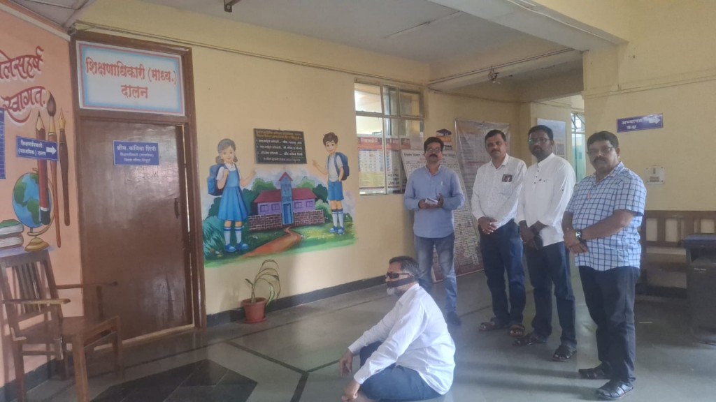 सिंधुदुर्गनगरी : शिक्षक शिक्षकेतर यांच्या प्रस्तावावर शिक्षणाधिकारी कार्यालयातून तोंडी व लेखी विनाकारण त्रुटी काढून प्रस्तावास जाणीवपूर्वक विलंब केला जात आहे. आपल्या किरकोळ कामांसाठी सुद्धा या कर्मचाऱ्यांना वारंवार हेलपाट्या माराव्या लागतात असे सांगतानाच मात्र पैसे घेऊन कामे जलद केली जातात असा खळबळ जनक आरोप शिक्षक भारती संस्थेचे संजय वेतुरेकर यांनी केला आहे. संजय वेतुरेकर यांनी शुक्रवारी माध्यमिक शिक्षणाधिकारी कविता शिंपी यांच्या दालनाबाहेर जमिनीवर बसून आणि तोंडाला काळी पट्टी बांधून आगळं वेगळं आंदोलन छेडलं यावेळी त्यांनी आपला संताप व्यक्त केला. शिक्षक भारतीच्या वतीने शिक्षक तसेच शिक्षकेतर कर्मचाऱ्यांच्या प्रलंबित प्रश्नांबाबत 15 ऑक्टोबर ते 17 ऑक्टोबर या कालावधीत साखळी धरणे आंदोलन केले जाणार आहे. मात्र या कर्मचाऱ्यांच्या प्रश्नांसाठी किती वेळा फेऱ्या मारायचा असा सवाल करत आता आपला नाविलाज झाला असून, आपण या ठिकाणी आत्मक्लेष आंदोलनासाठी बसलो असल्याचे श्री वेतुरेकर यांनी सांगितले.