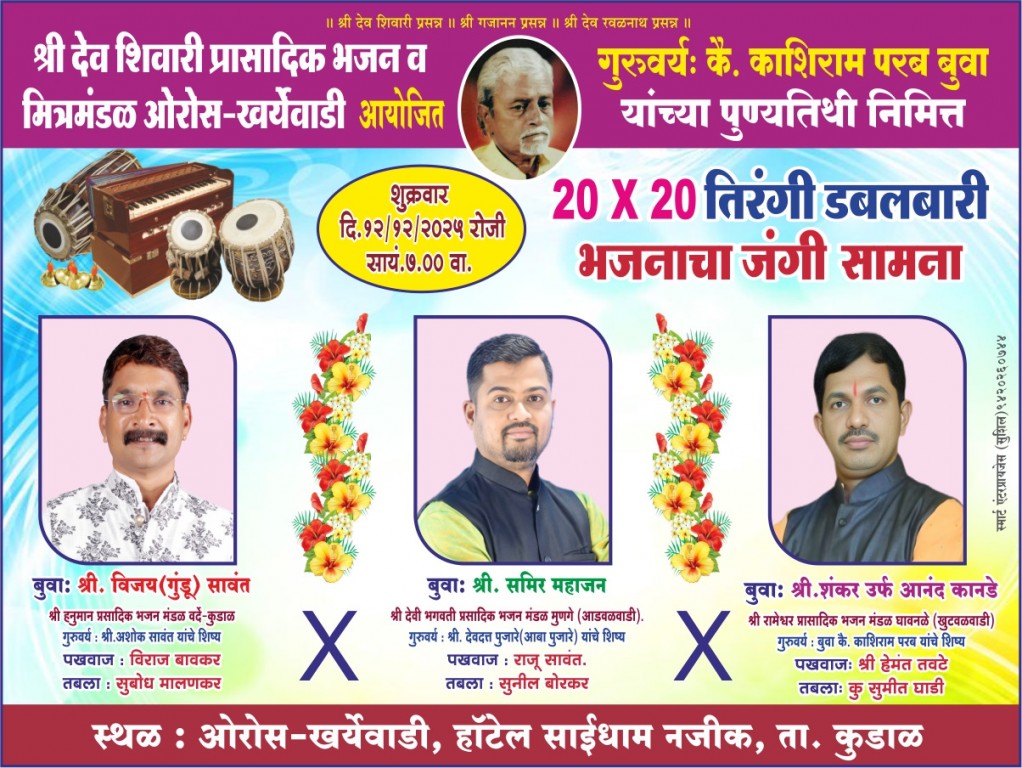 सिंधुदुर्गनगरी : ओरोस, जि. सिंधुदुर्ग श्री देव शिवारी प्रासादिक भजन व मित्र मंडळ, ओरोस खर्येवाडी यांच्या वतीने गुरुवर्य काशीराम परब बुवा यांच्या पुण्यतिथीनिमित्त शुक्रवार, दि. १२ डिसेंबर २०२५ रोजी सायंकाळी ७.०० वाजता भव्य तिरंगी डबलबारी भजनाचा जंगी सामना आयोजित करण्यात आला आहे. कार्यक्रम हॉटेल साईधाम, ओरोस खर्येवाडी (ता. कुडाळ) येथे होणार आहे.