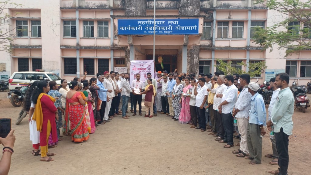 वेंगुर्ले : "गो" मातेला राष्ट्रमाता म्हणुन मान्यता मिळावी तसेच गो मातेचे संरक्षण, संवर्धन व्हावे या पवित्र हेतुने गो सन्मान आव्हान अभियानांतर्गत वेंगुर्ले तालुक्यातील गो पालक, गो प्रेमींनी एकत्र येत शासनाला द्यावयाचे निवेदन आज सोमवार २७ एप्रिल रोजी तहसीलदार ओंकार ओतारी यांना सादर केले. तसेच आमच्या भावना शासनापर्यंत पोहचविण्याची विनंती केली. यावेळी बाबुराव खवणेकर, गिरीश फाटक, प्रसन्ना देसाई, सुहास गवंडळकर, ॲड. सुषमा प्रभूखानोलकर, दिना आचार्य, गौरी मराठे, नितीन लिंगोजी, प्रज्वल कोयंडे, अभी वेंगुर्लेकर, कीर्तीमंगल भगत, विलास पालव, यशवंत कुडपकर, विद्या सावळ, सुनील खानोलकर, ॲड. प्रकाश बोवलेकर, देवदत्त सावंत, सुनील वारंग, सागर राणे, श्यामसुंदर राय, दिलीप परब, शरद परब, ओजस परब, हर्षद आरोलकर, सोहम गरगटे, प्रशांत सावंत, देवदत्त गोखले, अवधूत मराठे, संतोष सावंत, प्रदीप सावंत, बिपिन ववरसकर, दिलीप करंगुटकर यांच्यासह गो प्रेमी उपस्थित होते.